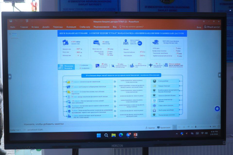 10:55 09.01.2026Yangi Namangan tumani hokimi “Go‘zal” mahallasiga bo‘lib, hudud yettiligi faoliyatini sarhisob qildi hamda 2026 yilga mo‘ljallangan asosiy vazifalar belgilab olindi. Uchrashuvda mahallaning ijtimoiy-iqtisodiy rivoji, aholi turmush sharoitini yaxshilash masalalari muhokama etildi.
